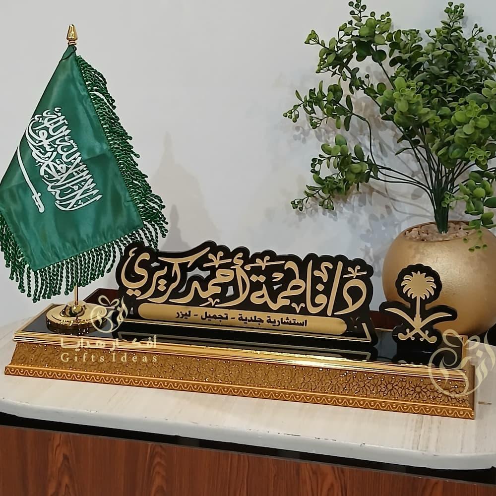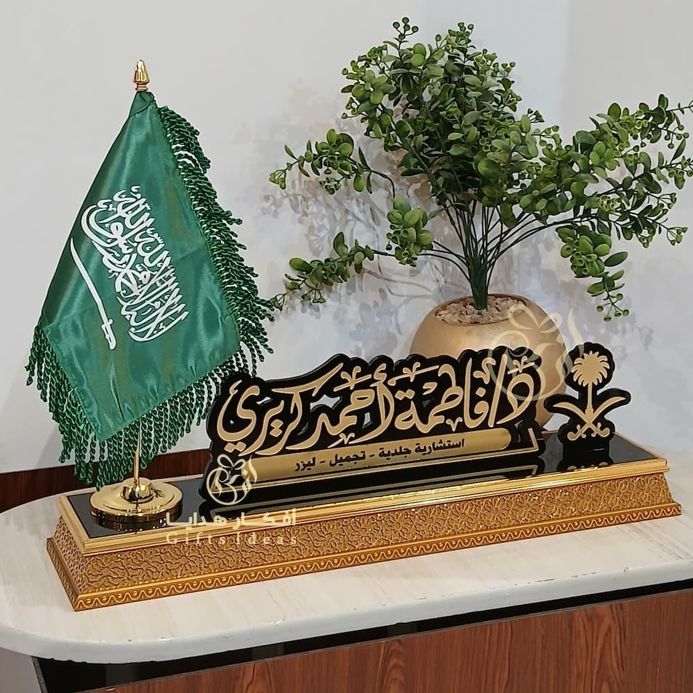 لوحة مكتبية ملكية بالأكريلك بالاسم والعلم السعودي