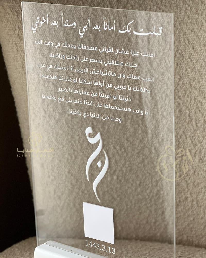 لوح بصمة عقد القران هو منتج مميز يتيح للعروسين والضيوف ترك بصماتهم كذكرى جميلة وفريدة من نوعها يتميز بتصميم أنيق وعصري حيث يتم تثبيت بصمات الأصابع باستخدام الحبر الخاص على اللوح ليُضاف إليها اسم العروسين وتاريخ العقد وعبارات حب مما يخلق لوحة فنية مميزة تحمل ذكريات لا تُنسى من هذه المناسبة السعيدة مثالي كهدية تذكارية لعقد القران، ويُضيف لمسة من الفخامة والابتكار على المناسبة