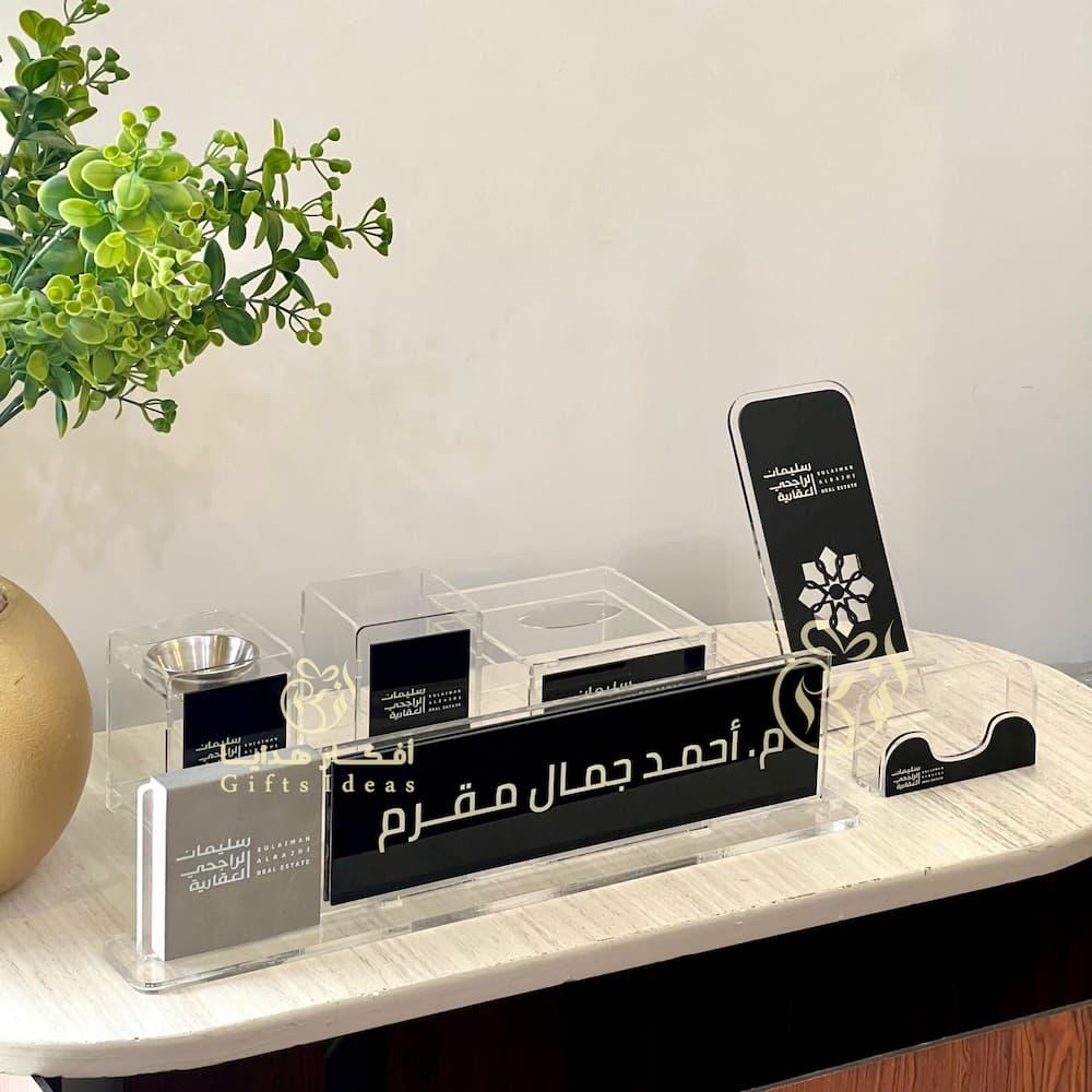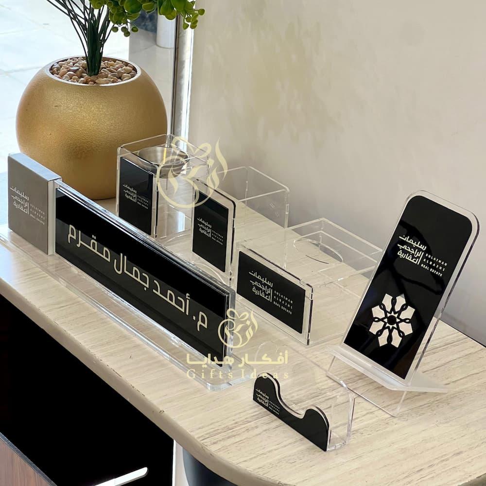 طقم مكتبي أنيق مصنوع من الأكريليك الشفاف بجودة عالية وتصميم فاخر يضفي لمسة جمالية على المكاتب والمساحات المكتبية الطقم يشمل مجموعة متكاملة من القطع الأساسية مثل حامل بطاقة العمل حامل القلم حامل الهاتف بالإضافة إلى قاعدة اسم محفورة حسب الطلب